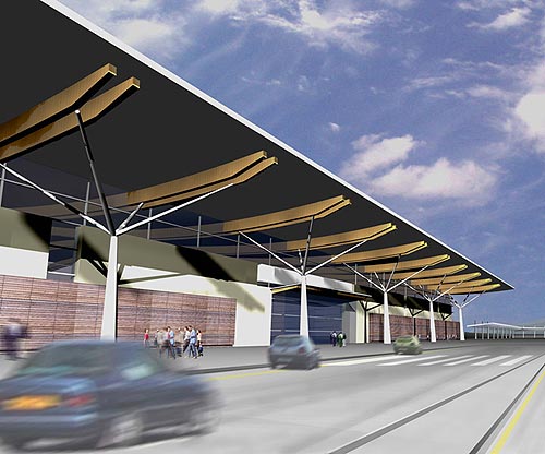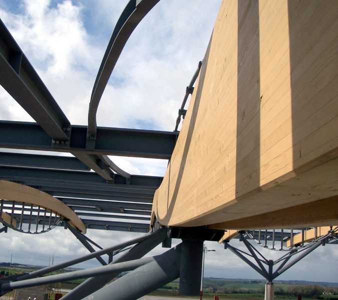 The roof of the new terminal building at Cork Airport combines glu-lam timber with steel struts and tie rods to create architecturally expressed bowstring beams on branching columns to contribute to the unique iconography of this tourist gateway.