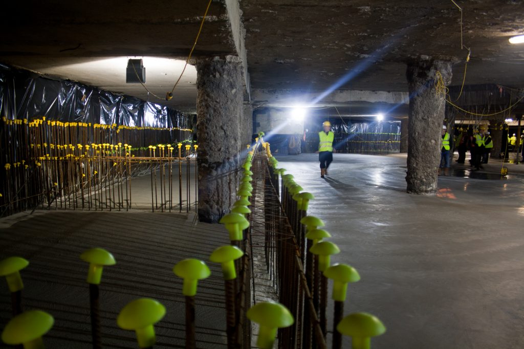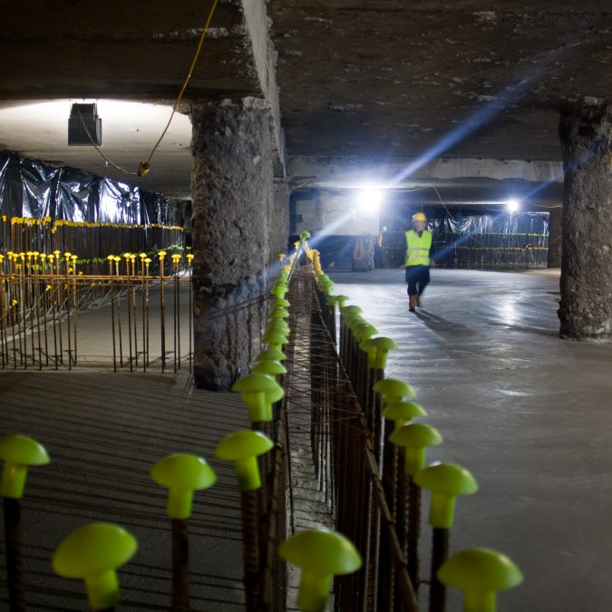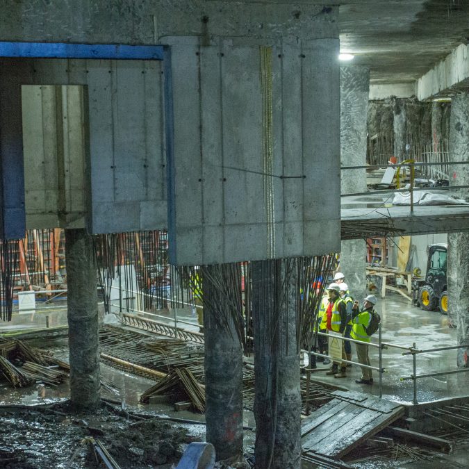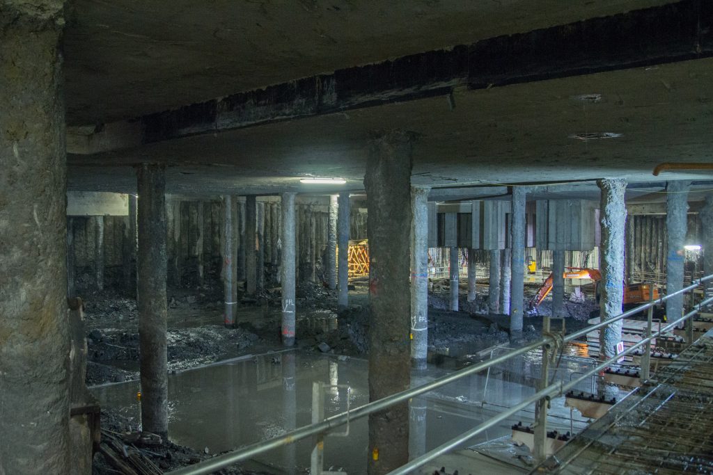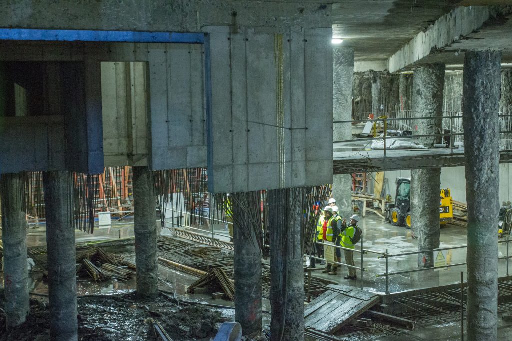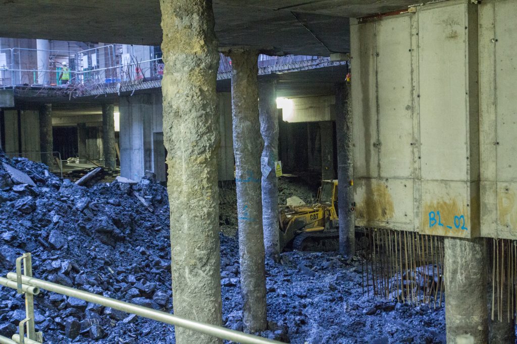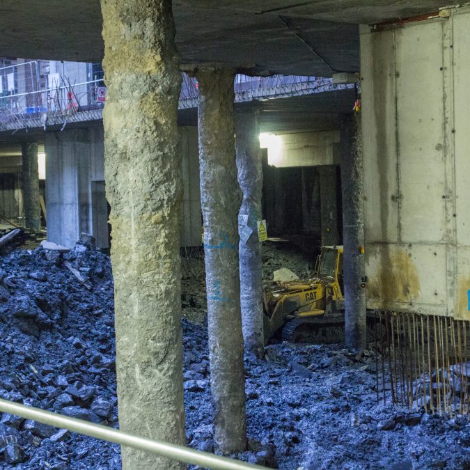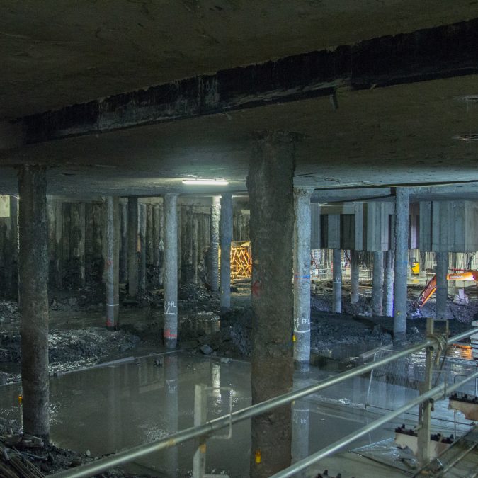 Supported on plunge columns in rock-socketed piles, the frame rose upward from ground floor level, topping off in July 2014, and securing the development permission. In 2015, we returned to site to construct the two-storey basement. Using a combination of topdown and bottom-up methods, the basement has touched final formation level in the bedrock beneath Ballsbridge.